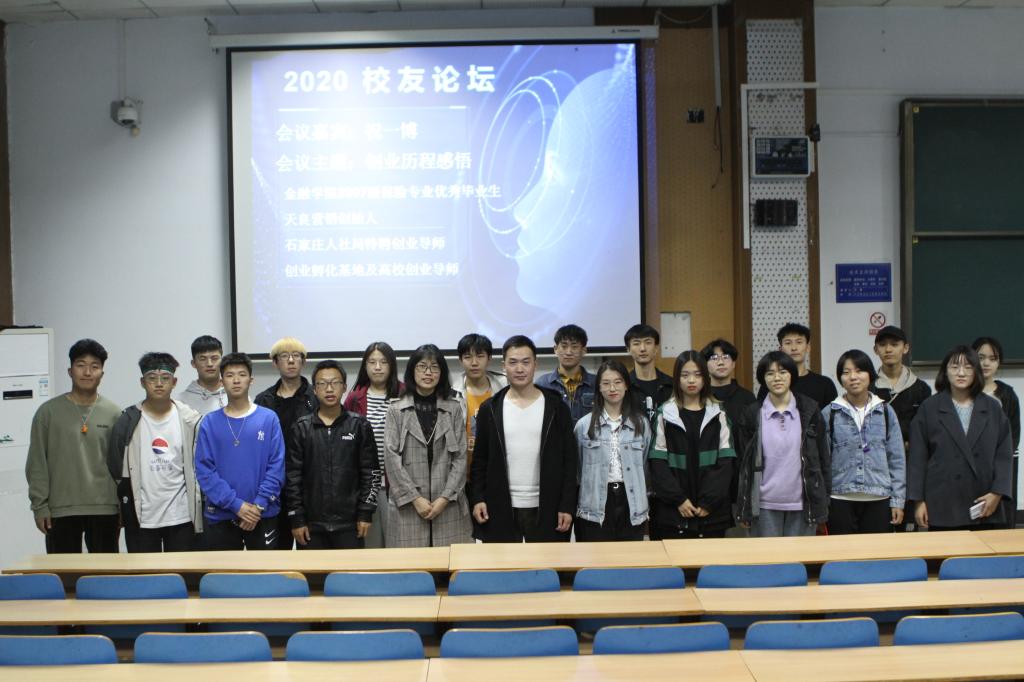 10月22日,金融学院在第三教学楼C225教室举办2020级“新生教育月”系列活动之校友论坛,金融学院副院长杨雪美出席,全体大一新生参加。此次校友论坛邀请到金融学院2007级保险专业优秀毕业生﹑天良营销创始人﹑石家庄人社局特聘创业导师﹑创业孵化基地及高校创业导师祝一博分享创业历程感悟。
