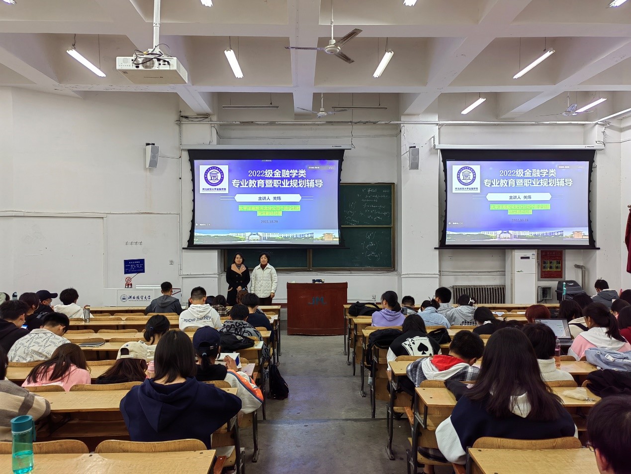 10月28日,我院开展22级专业教育暨职业规划辅导专题讲座,特邀金融学院首届(94级)保险学专业毕业生、太平洋寿险河北分公司个险企划部资深副总经理关炜做报告,金融学院党委书记贾喜环、副院长窦丽琛、副院长范庆祝出席讲座,学院2022级全体新生参加。范庆祝主持讲座。