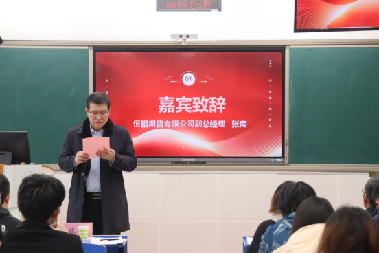 作为本次大赛的支持单位,恒银期货有限公司副总经理张南致辞并担任大赛评委,认为随着科技的不断进步和金融市场的快速发展,人工智能、大数据等技术的运用正在深刻改变着人们的投资方式和市场格局,大赛对于激发同学们学习金融知识的热情、培养投资分析能力和管理能力具有重要作用,充分肯定了决赛参赛选手的表现,并欢迎同学们到公司实习实践。
