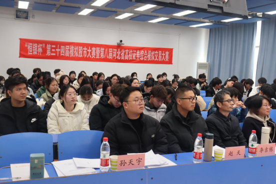 12月7日上午,河北经贸大学第三十四届模拟股市大赛暨第八届河北省高校证券综合模拟交易大赛团体赛决赛及闭幕式顺利举行。恒银期货有限公司副总经理张南、投教部主任张琼一,中国农业银行雄安分行孙天宇、安东石油财务部尹皓男、河北农业大学副教授赵天,金融学院教授李吉栋担任评委,金融学院相关领导及教师出席。金融学院副院长窦丽琛主持。