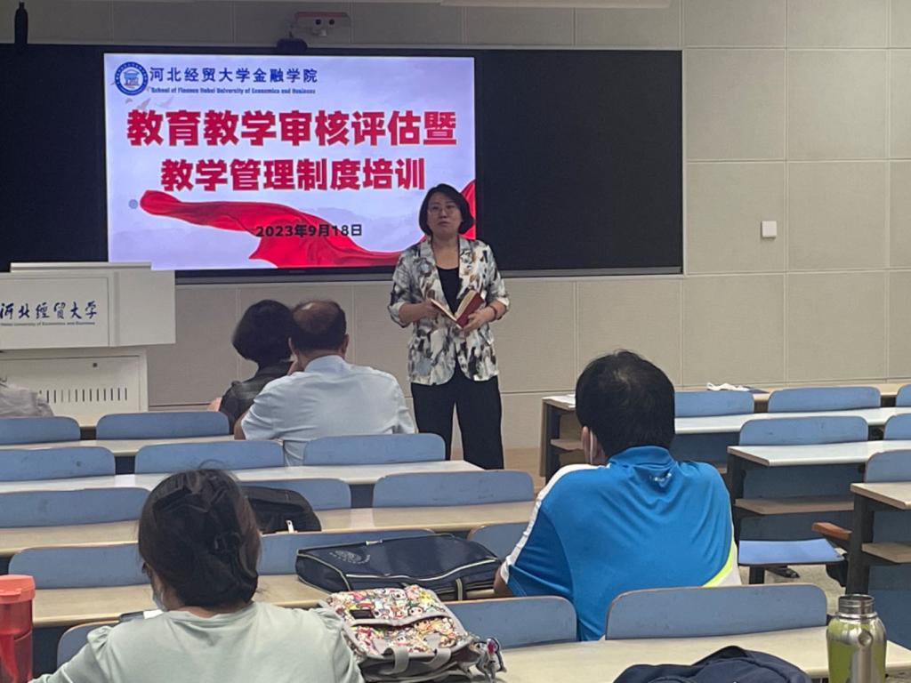学院副院长窦丽琛做主题培训。她首先强调了本科教育教学审核评估知识学习的重要性,带领大家集体学习了相关知识,尤其是学校新财经人才培养目标、培养特色、培养模式、专业人才培养学分结构等内容,并对课堂教学、课程资源建设等方面提出了要求。然后,她为大家梳理了学校的一系列规章制度,制作了共享学习文档,并带领大家集体学习了《河北经贸大学本科教学听课管理办法》《河北经贸大学本科教学调、停课管理规定(2023年修订)》等制度内容。