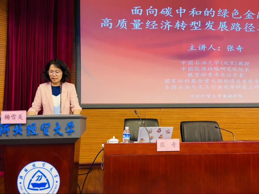 4月29日下午2点半,金融学院在国际学术报告厅成功举办第五十一期金融大讲堂。本期金融大讲堂邀请中国石油大学教授、中国能源战略研究院院长、国家社科基金重大招标项目首席专家张奇教授作题为“面向碳中和的绿色金融助推高质量经济转型发展路径与策略研究”的报告,金融学院院长杨雪美、副院长范庆祝、经济研究所所长李建英教授以及金融学院、国际教育学院师生近一百人参加,大讲堂由金融学院院长杨雪美主持。