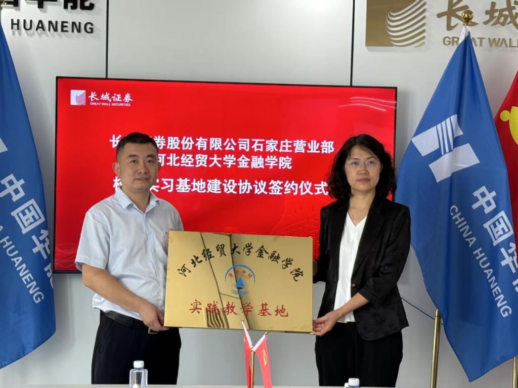 魏健向长城证券授予“党建联建共建基地”牌匾。杨雪美向长城证券授予“河北经贸大学金融学院实践教学基地”牌匾。