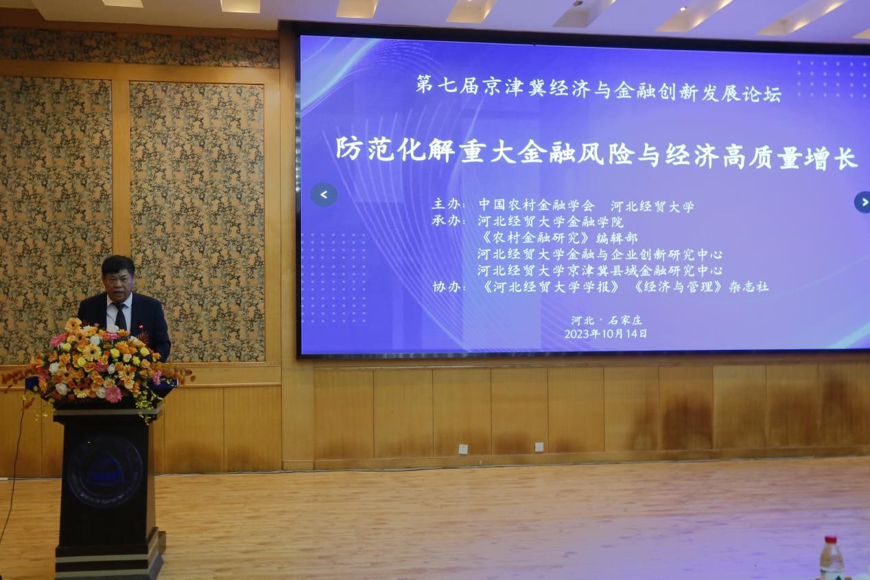10月14日,由中国农村金融学会、河北经贸大学主办,河北经贸大学金融学院、《农村金融研究》编辑部、河北经贸大学金融与企业创新研究中心、河北经贸大学京津冀县域金融研究中心承办的“七届京津冀经济与金融创新发展论坛”在我校国际会议中心召开。本届论坛的主题是“防范化解重大金融风险与经济高质量增长”。来自全国各地高校、科研机构与金融单位的50多名专家学者及我校科研处、学报等相关部门和数统学院、会计学院、金融学院师生代表参会。论坛由河北经贸大学党委常委、副校长杨金田主持。
