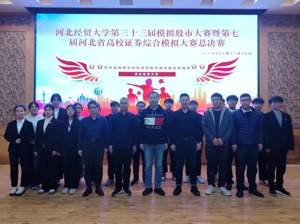 本次大赛由河北省高等学校经济学教学指导委员会指导,河北经贸大学主办,河北经贸大学金融学院承办,于2023年9月开幕,历时两个多月,分设个人赛和团体赛两部分。个人赛根据2023年11月17日模拟交易平台停止交易时的统计数据,由高到低排列所有参赛选手的总收益资金并确定获奖个人。团体赛根据所有投资分析报告,经专家评审,结合最后答辩成绩综合确定最终排名。来自河北师范大学、河北农业大学、河北地质大学、河北经贸大学等高校的五支代表队参加了团体决赛。