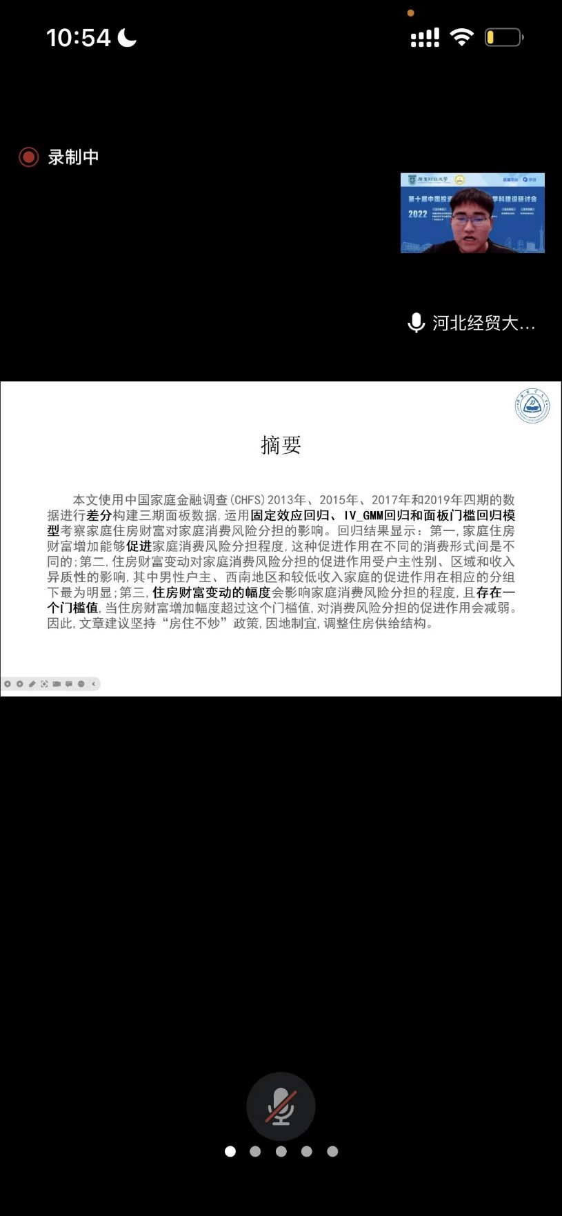 近日,我院2021级硕士研究生崔晶、杨妍、张天辉同学以云上会议的方式应邀参与第十届中国投资学年会暨投资学科建设研讨会以及2022年中国房地产学术年会暨第15届高校房地产学者专业研讨会,并圆满完成学术汇报。
