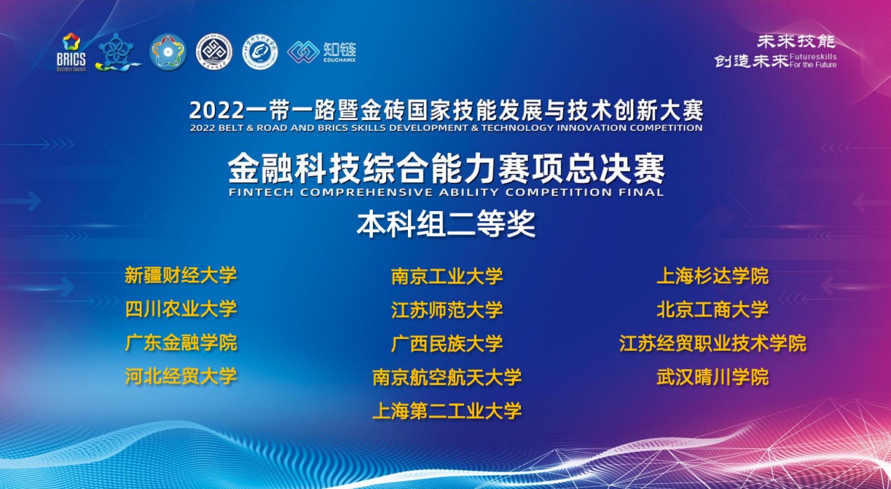 11月27日,“2022一带一路暨金砖国家技能发展与技术创新大赛金融科技综合能力赛项”总决赛落下帷幕。由我院孙玮老师指导,金融科技专业学生侯恒宇、张林冉、李颖昳、李浩同学组成的我校代表队荣获全国大赛二等奖,河北经贸大学获优秀组织奖。