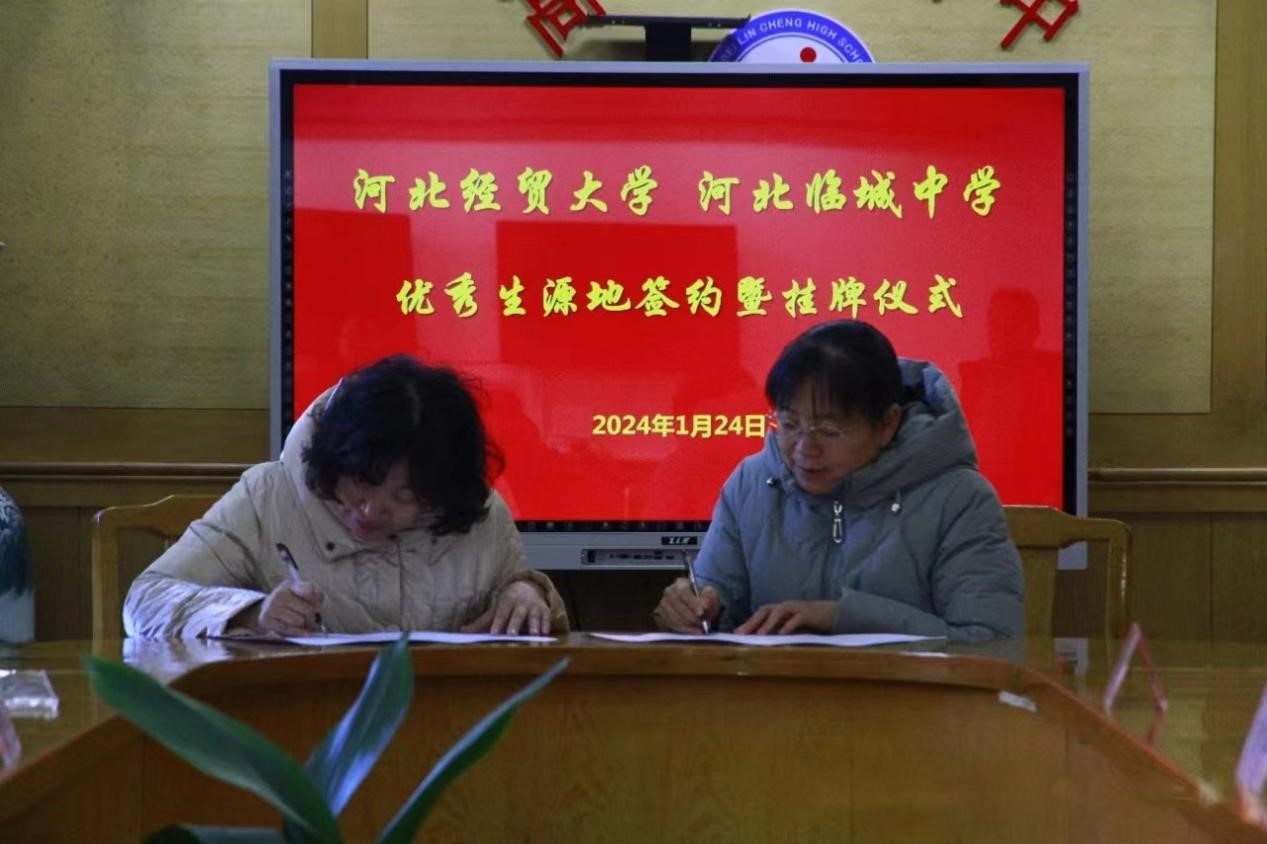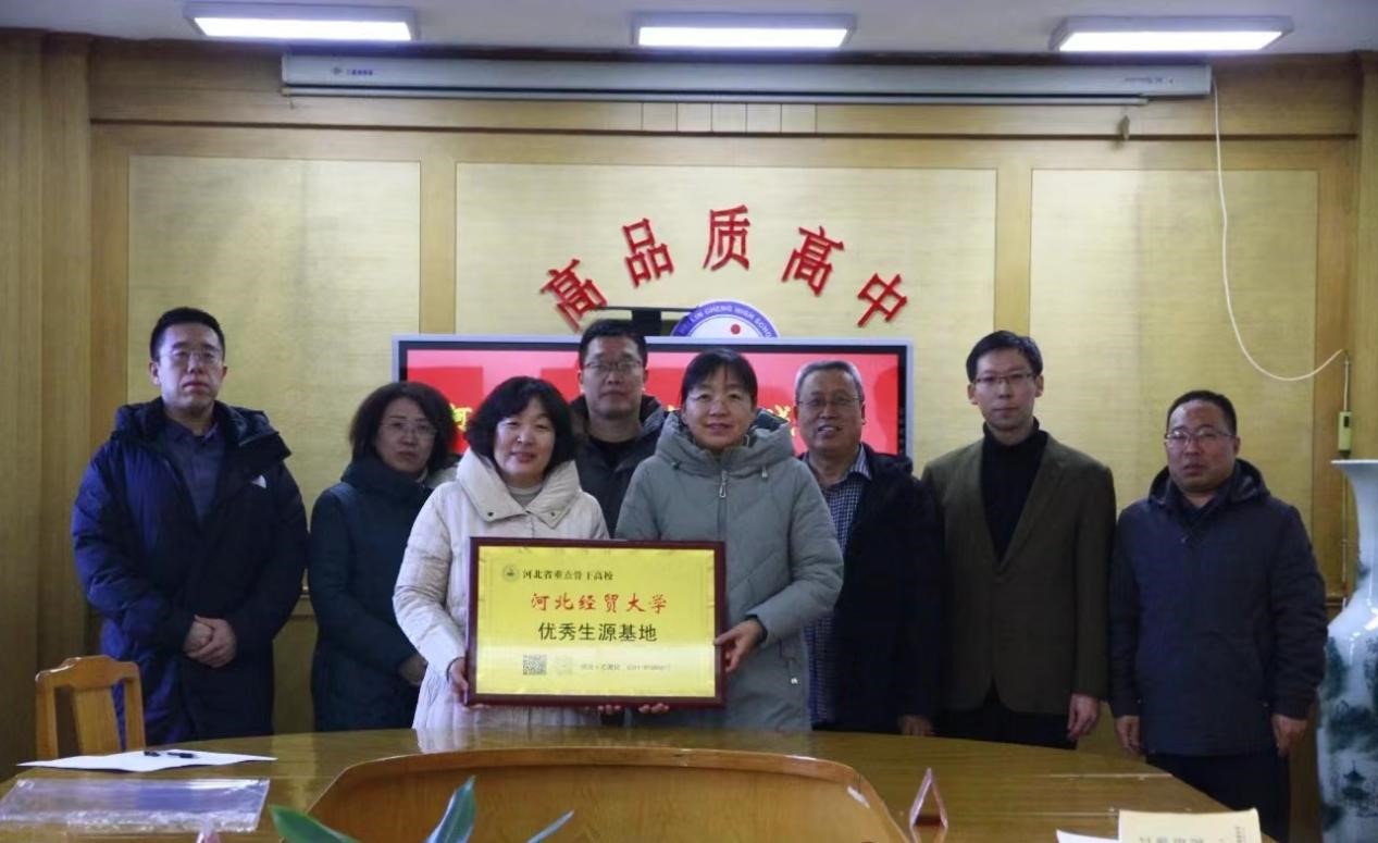 会上,双方签约结束后,我校负责人及临城中学负责人共同为河北经贸大学优秀生源基地揭牌。