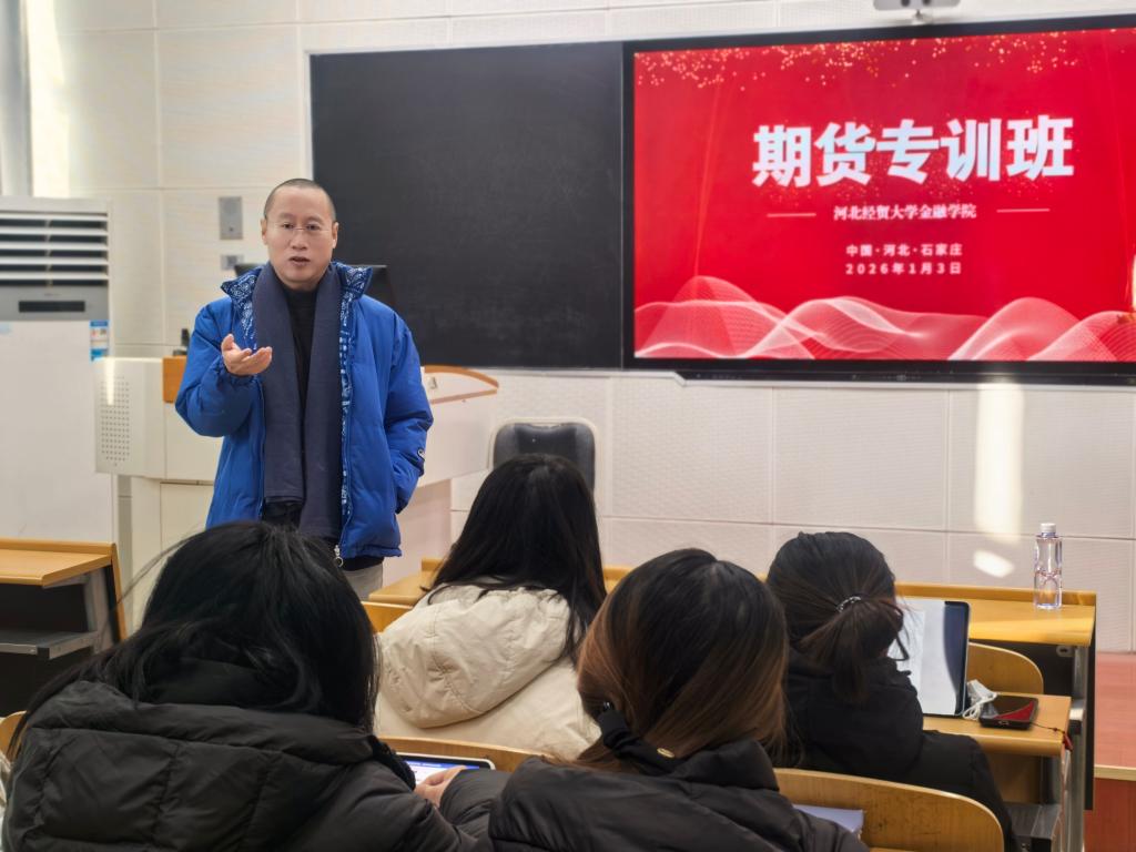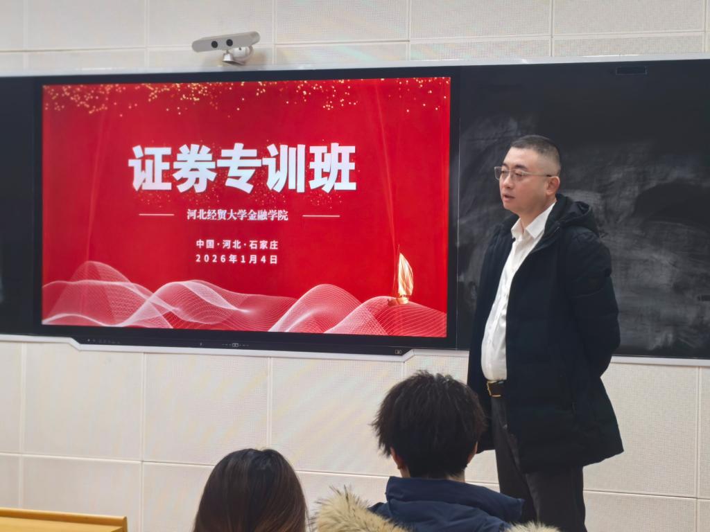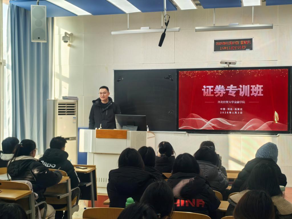 2026年1月3日,河北经贸大学证券期货实训班正式开班。永安期货股份有限公司石家庄分公司总经理王吉元、长城证券股份有限公司石家庄红旗大街证券营业部总经理助理闫红亮、河北岭石网络科技有限公司董事长邢本广、星月泓华私募基金总经理邢文豪、金融学院教师徐临、李吉栋、田懋及实训班学员参加开班仪式,金融学院副院长窦丽琛出席并致辞。