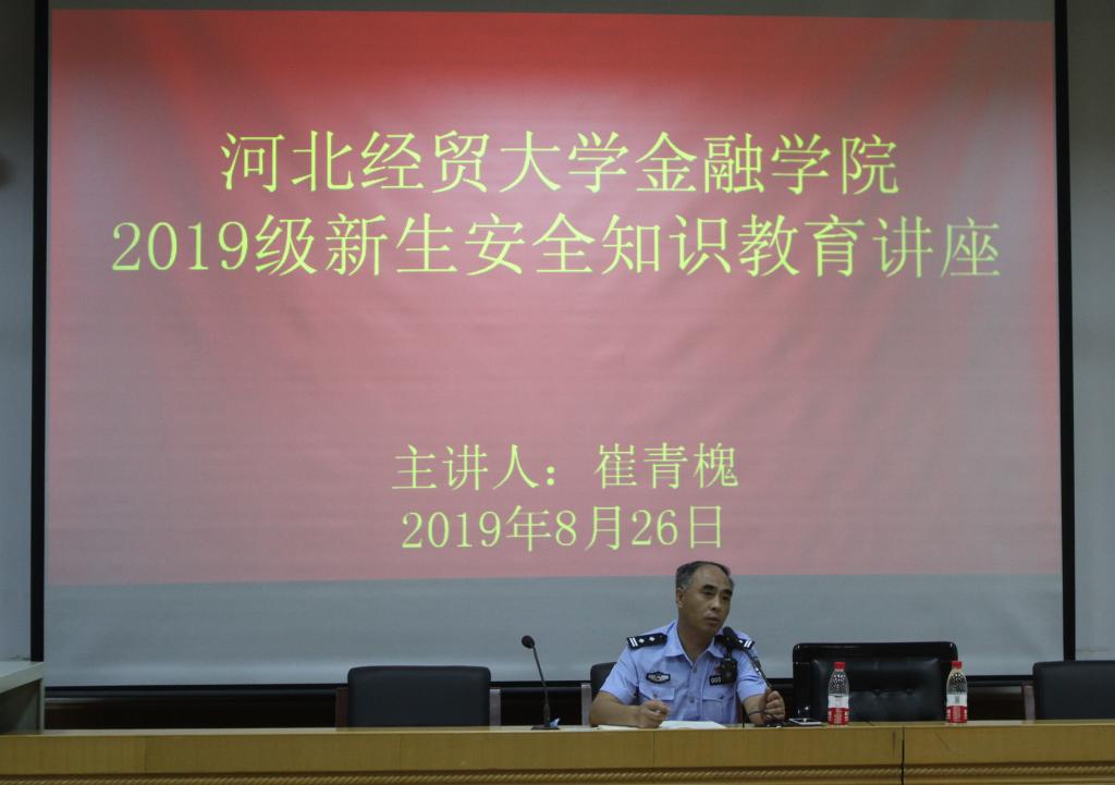 8月26日上午,金融学院邀请五七路派出所所长崔青槐开展2019级新生安全知识教育讲座活动。团委书记李德海出席,2019级全体新生、助理班主任及部分学生家长参加。