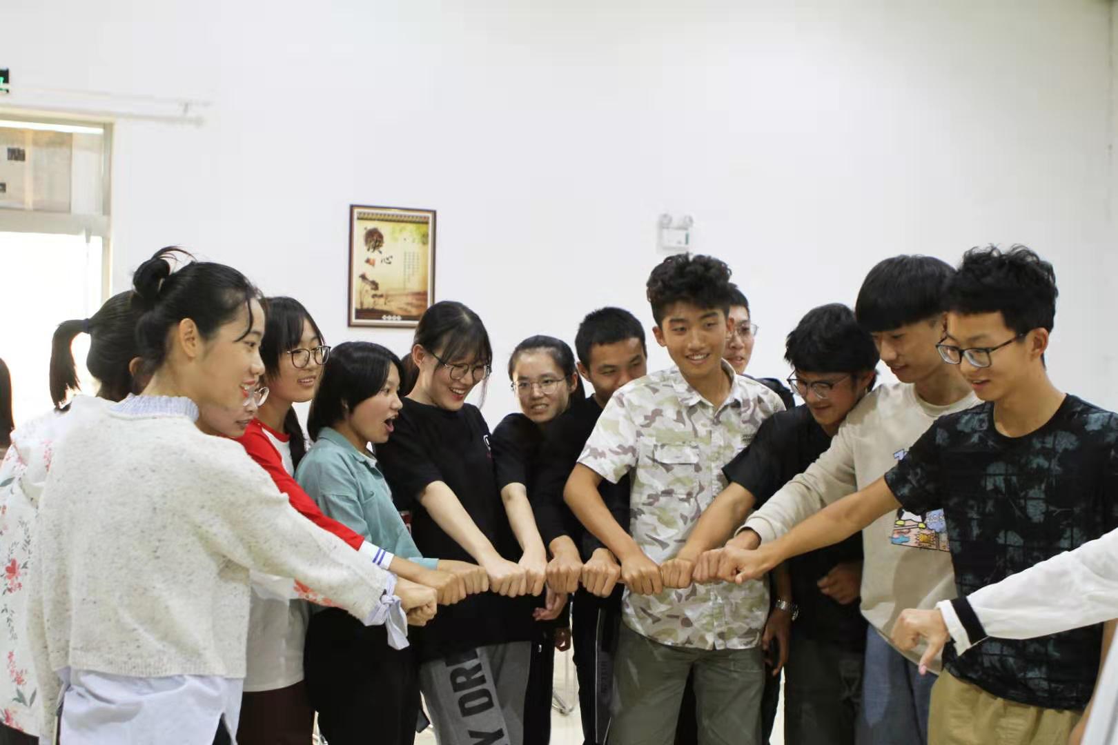 武彤彤老师首先带领同学们进入“雨点变奏曲”的暖身环节,让同学们利用手脚模仿大自然的声音,极大调动了现场活跃的气氛。随后,每位同学与其他同学自由握手并自我介绍,在校住宿时间长的同学积极分享自己住宿经验以及与舍友之间的趣事,进一步拉进了同学之间的距离。最后,武彤彤老师将全班同学分为六组,让同学们自由发挥设计组徽,同学们在游戏过程中相互了解,增进感情。