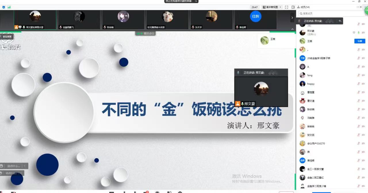 近日,金融学院邀请我校校友、青岛恒信控股石家庄交易团队负责人邢文豪以线上形式为学院学子做了题为《不同的金饭碗该怎么挑》的辅导讲座。金融学院党委副书记王薇主持会议。
